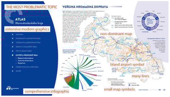 Linguistic analysis can also be considered as part of the satisfaction analysis. In the case of the frequency of nouns, the words region (occurrence in the title of the atlas and the questions), transport (the most discussed topic), map, part, and area (part of the questions) appeared most frequently in the statements. Among the most frequent verbs, the forms have, describe, find, and see could be found. These frequent verbs were due to the questions asked and read aloud by the participants. The verb to see was said by participants when they were describing the area of occurrence of information or, on the other hand, when they could not find something, i.e., not see it. One of the initial questions asked about the number of maps in the atlas. The follow-up sentence suggested that participants tended to count the maps by hand immediately after reading the question. However, some of them subsequently realised that “it could be stated somewhere”. Those who chose to count the maps counted the number of maps incorrectly. Another topic was temperature and precipitation, and participants were asked to find the value of the average annual temperature in the county. Participants tried to read this information from the map where daily temperatures were given. The correct answer was given in the corresponding infographic. Often, parts of the description such as annual, daily, minimum, maximum, and average were pronounced. The next topic was traffic volume. Participants found it difficult to find the right answer to the question about the evolution of the number of cars in the region. The correct answer was in the map description and in the corresponding infographic. According to the statements, the infographic in question was described as weird, horrible, confusing, and not clear. The last topic defined was the most controversial and focused on public transport (see Figure 11). Participants were asked to identify the types of transport to Ostrava Airport. The information was searched for by the participants in the text around the main map and sentences such as “I can’t see it anywhere” or “I’m blind” appeared. Subsequently, participants switched to searching for information on the map. Finding Ostrava airport was also a problem as participants looked for it in the city of Ostrava, not near the village of Mošnov (where the airport is located). Therefore, many answers gave the form of transport as public transport or on foot. Another problematic question was identifying the biggest operator of public transport lines in the region. This information was provided in a similar type of infographic. After the previous experience, participants were both disappointed and unpleasantly surprised by this finding. There were expressions such as “…there’s that horrible graph again”. To avoid searching the graph, some participants tried to find the information in the text they were reading aloud but without success.