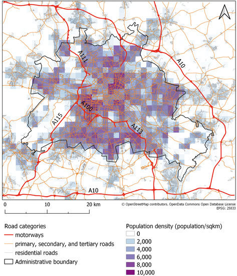 Berlin, the capital of Germany, is located in eastern Germany and covers an area of about 890 km2, of which 15% is traffic area [22]. In 2021, Berlin had approximately 3.66 million inhabitants. The population density was higher in the central part of the city within the inner commuter train circle [23]. Berlin is crossed by the motorways A100/A111/A113 in the NW-SE direction and the motorway A115 in the SW-NE direction. These motorways all connect to the motorway ring A10 surrounding Berlin and leading long-distance traffic around the city (Figure 1).