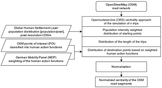 Overview of the OpenRouteService (ORS) centrality simulation as developed by [15], extended by the weighting of the human action functions according to statistics from the MOP [24].