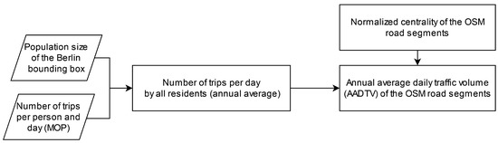 The total number of trips per day was calculated by multiplying the total population within the bounding box of Berlin by the annual average daily number of 1.71 car trips per person provided by the MOP statistics [24]. Finally, we estimated the AADTV for each road segment as the product of the normalized centrality value and the computed total number of trips (Equation (3)).