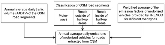 Figure 4 provides an overview of the GHG emission estimation from the AADTV. We classified the OSM road segments into three categories based on the road types of TREMOD shown in Table 2: OSM “motorways”, “roads outside of built up areas” and “roads inside of built up areas”. OSM roads tagged as “highway = motorway” were categorized as motorways. All remaining roads were categorized as “roads outside of built-up areas” if they were outside of the administrative boundary of Berlin and as “roads inside of built-up areas” if they were inside the administrative boundary of Berlin. The emission factors ef were calculated as weighted averages between the emission factors for cars and the emission factors for two-wheelers provided by TREMOD [27] (Equation (4)). The weights w were based on the number of motorcycles and cars in Berlin provided by the Federal Motor Transport Authority [26].