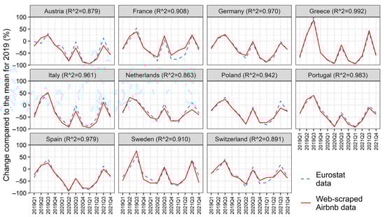 We claim that the changes in the number of reviews over time reflect the changes in overall tourism visits. We do not use Airbnb reviews as a proxy for the absolute number of tourist stays in a destination, so the differences in the popularity of that service across countries and destinations should not affect the results. To verify if the dynamics of Airbnb reviews are proportional to the dynamics of all tourism stays, we compared the obtained data with Eurostat statistics on tourism arrivals (inbound and domestic combined) to 31 countries (members of the European Union and the European Free Trade Association) during the years 2019–2021 [67]. We calculated the seasonality indices for 12 quarters by dividing the number of stays during a quarter by the average number of stays during 2019. Respective values for Airbnb data were obtained by averaging the numbers in all destinations in a country weighted by the number of offers in destinations. There was a very high correlation in the trajectories of changes in tourism measured by official statistics and Airbnb data. The coefficient of determination of indexes based on Eurostat and Airbnb data was very high (R2 = 0.875) for all 31 countries combined and even higher for individual countries (Figure 1).