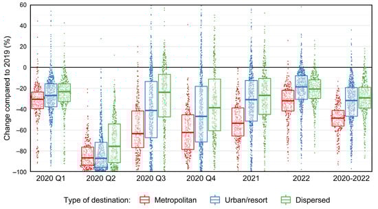 In all periods, metropolitan destinations were most affected by the epidemic. Dispersed destinations were the least, except for the year 2022, when dispersed destinations lost more visits than urban/resort ones (Figure 2). The analysis of variance (Table 7) shows that the differences between the three types of destinations were statistically significant during the entire period of the pandemic. However, in its third year, the difference between urban/resort and dispersed destinations was not significant anymore. In Q1 2020, the differences were slight but statistically significant (between metropolitan and two other types of destinations). In Q2 2020, dispersed destinations stood out, with significantly lower decreases than the other two types. Starting from the second part of 2020, the differences were similar to those observed for the entire period.