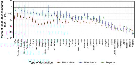 There were notable differences in the rates of changes and relations between various types of destinations between countries. The most remarkable declines during the entire period were typical for most East and Southeast Asian countries, with the slightest reduction in visits in the USA, Russia, and Australia (Figure 3 and Figure 4). More significant drops in visits to metropolises than to other destinations were visible in most countries. Still, the size of that difference and relations between urban/resort and dispersed destinations varied between countries. Generally, the difference between metropolitan and dispersed destinations was strongest in countries with the slightest decline in reviews. The falls in tourism trips in countries changed over time following the dynamics of the pandemic (Figure 5).