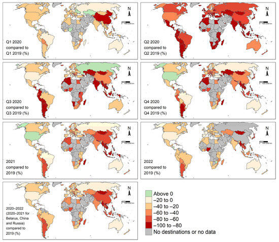 The pandemic’s effects on destinations were quantified as the relative change in the number of reviews between the pre-pandemic year 2019, or a quarter of that year, and the corresponding period of the pandemic years 2020–2022. Due to the dynamic situation in the first period of the pandemic, four quarterly indices were calculated for the year 2020. Then, we calculated yearly indices for the second and third years of the pandemic (2021 and 2022). Finally, an aggregate change index was calculated as a change between the value for 2019 and the average for three years of the pandemic (2020–2022).
