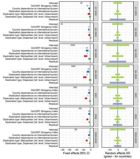 The results of the linear mixed-effects model (Table 8; Figure 6) confirm the significant and stable impact of both controlling variables (local policy stringency and the level of internationalisation of tourism destinations) on the fall in tourism periods in most of the analysed periods. Apart from the intercept decrease in tourism visits by 45.6–37.7% in the years 2020–2022 compared to 2019, the increase in policy stringency by one standard deviation reduced tourism arrivals by an additional 0.4 to 3.5%. The impact of sanitary regulations was more visible in the first year of the pandemic, and later declined, but remained significant. One standard deviation increase in country and destination dependency on international tourism added a further 0.8–5.9% and 3.2–5.6%, respectively, to that drop. The effects of the share of international tourists were particularly strong between Q3 2020 and the beginning of 2021. Metropolitan destinations had a 7.5 to 12.4% additional loss in tourism visits compared to urban/resort destinations, confirming the first hypothesis. This effect increased with time until 2021 and then started to decline. On the other hand, no significant difference has been noticed between dispersed and urban/resort destinations during any period, so the results have not supported the second hypothesis.