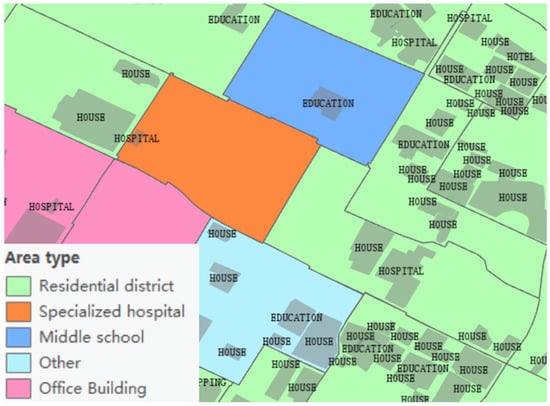 Functional area: The functional area is divided based on the real urban road network and urban AOI as shown in Figure 2. The urban road network is mainly composed of urban trunk roads and branch roads, which naturally divide the city into (and connect) several small areas. Then, the POI type is identified, and multiple adjacent AOIs of the same type are formed into functional areas. People live and work in functional areas, which are the starting and end points of daily travel. Through functional areas, we can more accurately understand people’s travel rules related to functional characteristics.