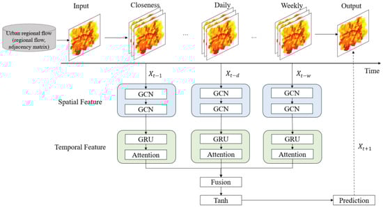 Due to the complex nonlinear spatiotemporal correlation in traffic flow data, traditional methods may not be able to reveal the deep relationships between various urban spatiotemporal sequence data related to traffic flow. The development of computer vision has led to the emergence of deep learning, which is a suitable choice for traffic flow forecasting tasks. As a result, many researchers have applied deep learning neural networks to traffic flow forecasting and achieved promising results [16,17]. The recurrent neural network (RNN) [18,19] and its variants, such as long short-term memory (LSTM) [20] and gated recurrent unit network (GRU), are frequently used to forecast traffic flow. Although RNN, LSTM, and GRU are effective in capturing the temporal characteristics of traffic flow, they may not capture the spatial characteristics of traffic flow. To address this limitation, scholars have used convolutional neural networks (CNN) [21] to model traffic flow. However, traffic flow data have non-Euclidean structures and nodes with no fixed domain structure, making it challenging to convolve them. Therefore, graph convolutional neural networks (GCN) [22,23] have been introduced, which can effectively mine the spatial dependence of traffic flow. To fully exploit the temporal and spatial characteristics of traffic flow, scholars have proposed T-GCN (temporary graph convolutional network) [24], a forecast model that considers the temporal and spatial information of traffic flow. This model combines the graph convolutional network (GCN) and gated cycle unit (GRU). GCN is used to learn complex topological structures and obtain spatial correlation, while GRU is used to learn the dynamic changes of traffic flow and obtain temporal correlation.