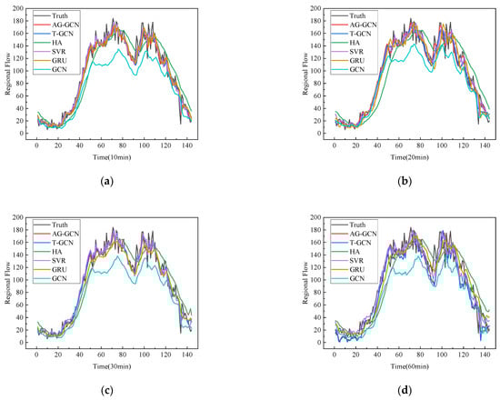 - The AG-GCN model outperformed other benchmark models in forecasting functional area traffic flows based on real datasets. Figure 4 shows the inflow prediction of different models within a day (with 10 min time steps). It can be seen from the figure that the AG-GCN model maintained good and stable prediction performance for 10, 20, 30, and 60 min, while other benchmark models showed a decline of about 1% in prediction performance with increasing time steps. This indicates that the AG-GCN model can learn the complex patterns of functional area traffic flows and capture its spatiotemporal variations.