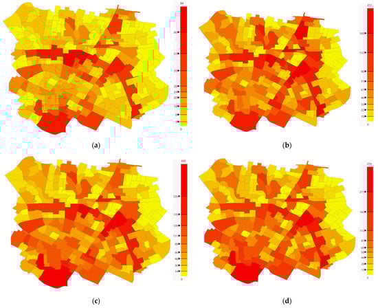 Inflow and outflow heat map of functional areas at different time periods: (a) 6:00 a.m.; (b) 9:00 a.m.; (c) 6:00 p.m.; and (d) 9:00 p.m.