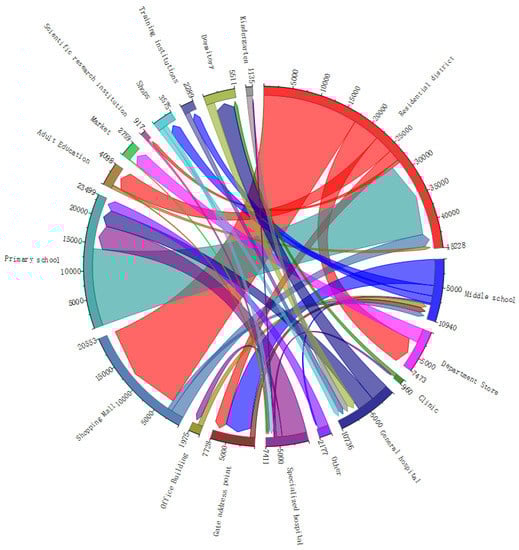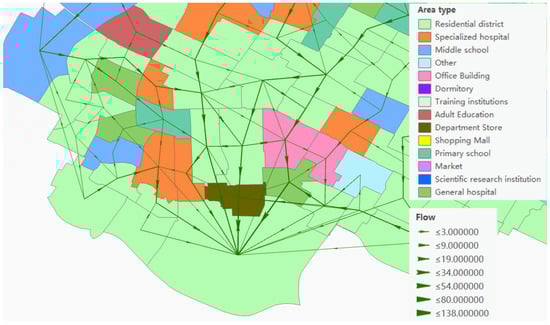 This study examines the traffic flow characteristics between different functional areas and offers reference for urban traffic management. Figure 7 illustrates the inflow and outflow of traffic flow between each functional zone and its adjacent areas during the morning peak hours (8:00 a.m.–10:00 a.m.), where the arrow direction indicates the direction of traffic movement, the number indicates the size of traffic flow, and different colors represent different functional areas. The following observations can be made from Figure 7: