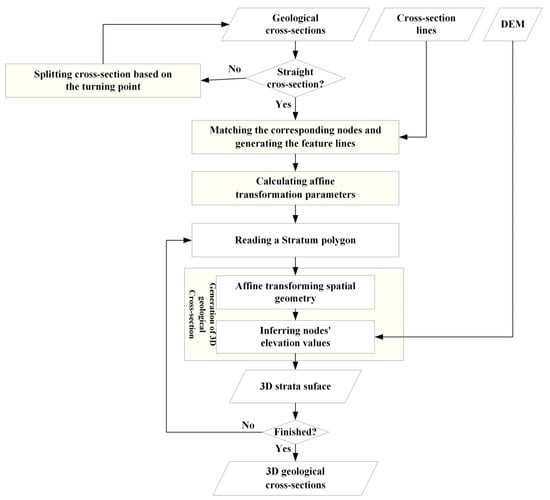 The proposed method in this study takes the stratum surface in the GC as the experimental unit, mainly including the following four processing steps: (1) matching the corresponding nodes between the GC and the GCL and generating the internal feature lines; (2) calculating affine transformation parameters and constructing affine transformation matrix; (3) calculating the node value to obtain the 3D stratum surface based on the ground elevation and the position of each node on the stratum polygon; (4) merging all 3D strata surfaces to obtain a 3D GC. If the GCL is bent, it is necessary to divide the GC at the turning point vertically, then to use steps (1)–(4) to process each divided GC, and finally to merge all the divided parts. Figure 2 shows the flow chart for generating 3D GCs based on 2D GCs by increasing dimensions. The following will take GCs M-M’ (Figure 1b(1)) and B-B”-B’ (Figure 1b(2)) as the actual cases of straight GC and bent GC, respectively, and detail the proposed method.