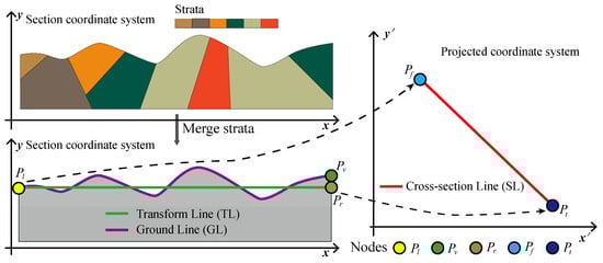 The boundary lines on the left and right sides of the 2D GC provided in this study are strictly perpendicular to the X-axis in the planar coordinate system, so two nodes (nodes and in Figure 3), corresponding with the starting node and the ending node of the straight GCL, can be obtained on both sides by constructing a line (transform line, , in Figure 3) perpendicular to the two vertical boundary lines. In addition, the top line between (ground line, , in Figure 3) two nodes (nodes and in Figure 3) in the upper left corner and the upper right corner of the 2D GC represents the surface undulation. In Section 3.3, it can help to judge whether the nodes are located on the surface, so it needs to be generated in advance.