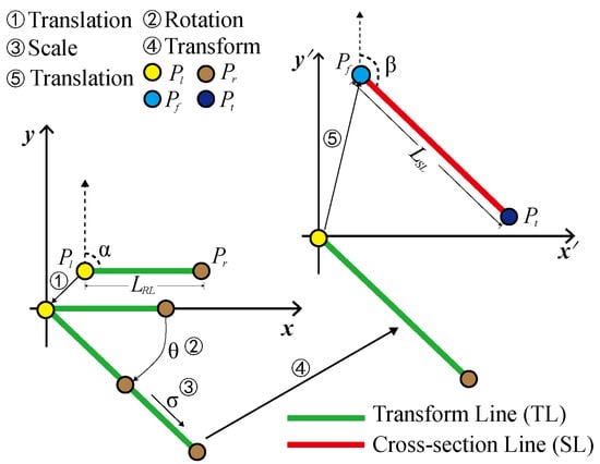The 2D GC is usually formed by the projection transformation of the 3D geological information and mapping it onto the map, and its 2D spatial coordinates, direction, and scale are changed, which is inconsistent with the actual GC geometry [8]. Thus, it is necessary to adjust its spatial geometry on the XY plane prior to constructing a 3D GC. The affine transformation [32,33,34] enables the geometric topology, scale, or spatial relationships of an image or geometry to be consistent before and after the transformation. In order to maintain the consistency of the above spatial features in the 2D GCs in this study before and after transformation, the affine transformation is the best choice. The affine transformation mainly includes two core steps: matching corresponding points; and calculating affine transformation parameters including translation length, rotation angle, scaling coefficient, etc., and the former is the basis of the latter. In this study, we will find or create two nodes from the 2D GC to correspond with the starting node and the ending node of the straight GCL and further calculate the affine transformation parameters.