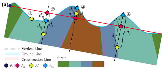 - The boundary lines on the left and right sides of the geological cross-section are not vertical. It is an essential prerequisite for the proposed method that the boundary lines on both sides are vertical. With non-vertical lines, it is difficult to effectively match corresponding points and generate feature lines, which affects the accuracy of the 3D transformation;