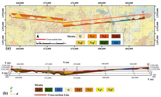 Figure 7e shows the scene of the overlapping GC and planar geological map, which can easily and intuitively display the 3D distribution of strata. The planar geological map shows the distribution of strata in the horizontal direction, and the GC shows the distribution and depth in the vertical direction. The two work together to visualize the strata in 3D. For example, it is evident that the boundaries of the strata λπ3 and ταπ3y/5 in the cross-section could completely fit with these in the planar geological map. However, one point to note in this study area is the following: in the 2D GC, the Quaternary strata are not distinguished by age and are uniformly replaced by Q; the planar geological map distinguishes and gives different colors to the Quaternary strata of different ages, so the two will have color differences after fitting, but the result is correct.