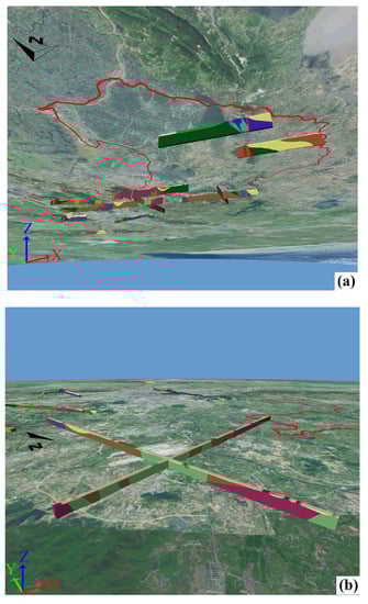 The strip distance is the crucial factor in determining whether the 3D modeling of a single GC is effective. The value of depends on the geological environment in the study area. The distance value should be as small as possible for areas with intense tectonic activity. On the contrary, the distance value can be further increased for a stable sedimentary environment area. It is also acceptable for some unturned fold zones when the distance between the parallel cross cross-sections is far [7]. Of course, the corresponding distances of different GCs in the same area are also different. Therefore, by comparing the 14 GCs and their geological maps in Nanjing, we selected different strip distances to build their 3D solid models (Figure 10).
