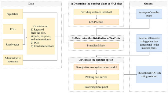 Figure 3 presents the workflow of our proposed framework for siting NATs, which consists of 3 main steps. Firstly, the number plans of NAT sites are determined using the LSCP model, which generates multiple plans, with varying numbers of NAT sites under coverage constraints and distance thresholds. In the second step, alternative siting plans for NAT sites are determined for each number plan using the P-median model, with a constraint on minimizing the total travel cost. This step aims to improve the distribution of NAT sites for each number plan. Finally, the optimal siting solution is selected using a bi-objective optimization model that balances the construction costs and travel costs.