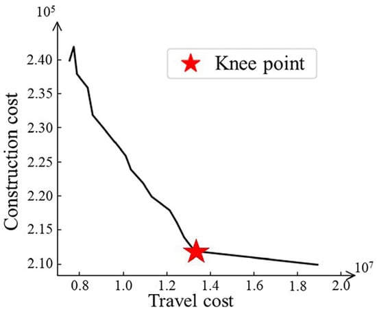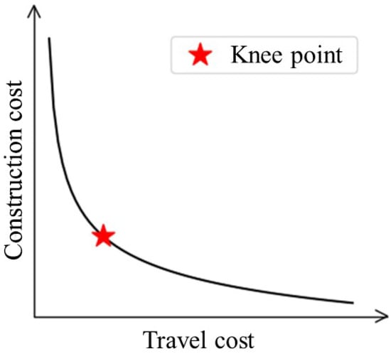 Accordingly, the curve between travel cost and construction cost is depicted in Figure 7. It is generally a convex curve, which could satisfy the premise for using the Kneedle algorithm. Finally, we selected the alternative siting plan with corresponding to Figure 6b based on the Kneedle algorithm.