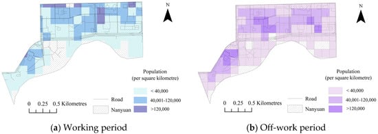 We took the subdistrict of Nanyuan as an example to demonstrate the outcomes of each step in our proposed method. As shown in Figure 5, Nanyuan is a typical subdistrict with a dense and heterogeneous population. Significant population dynamics can be observed in Nanyuan during the working and off-work periods of the day. These properties of Nanyuan make it suitable to demonstrate the adaptability of our method.