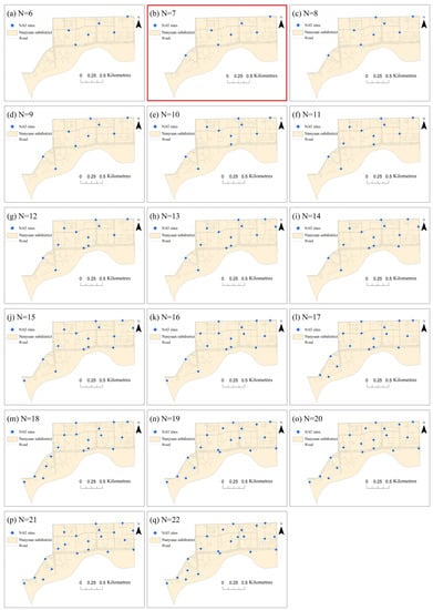 For simplicity, in this subsection we focus on the siting plans in Nanyuan during the working period. Using the Location-Allocation tool in the Network Analysis module integrated within ArcGIS 10.7, the LSCP and P-median models were applied sequentially to the Nanyuan subdistrict. Within the given interval of walking distance (i.e., 300 m to 900 m), we could obtain 17 alternative siting plans of Nanyuan, in which the number of sites ranged from 6 to 22. The distribution of the NAT sites under each plan is plotted in Figure 6. It can be seen that, with the increment of , more sites tend to be placed, which resulted in lower average travel costs for residents, but higher construction costs.