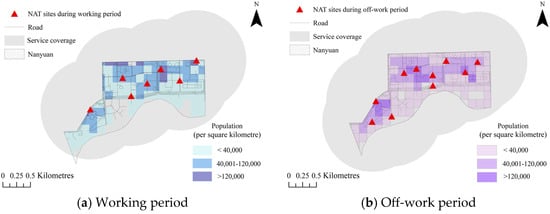 Following the same steps described in Section 4.1, we further obtained the optimal siting solution for the off-work period in Nanyuan. The distribution of NAT sites during 2 periods is compared in Figure 8. It can be found that the spatial layout of siting solutions has a strong connection with population density. The optimal plan for the working period sets fewer NAT sites than that during the off-work period. This could be explained by people being clustered in workplaces, so setting fewer sites at the centre of people’s workplaces would be sufficient. However, as the population disperses after work, more NAT sites are required in order to accommodate people in remote regions.