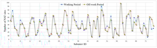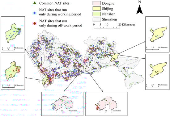 As shown in Figure 9, most subdistricts have a close number of NAT sites during working and off-work periods. However, there are a few subdistricts that have a higher number of NAT sites during the off-work period than during the working period. For example, the Baolong subdistrict (ID = 2) is intended to be a high-tech industrial gathering centre, and the land is mostly used for industrial production. Figure 9 demonstrates that there are 78 NAT sites in Baolong during the working period, and only 64 during the off-work period. On the contrary, the subdistrict Longcheng (ID = 33) has a resident population of roughly 500,000. During the off-work period, there are 10 more NAT sites than there are during the working period.