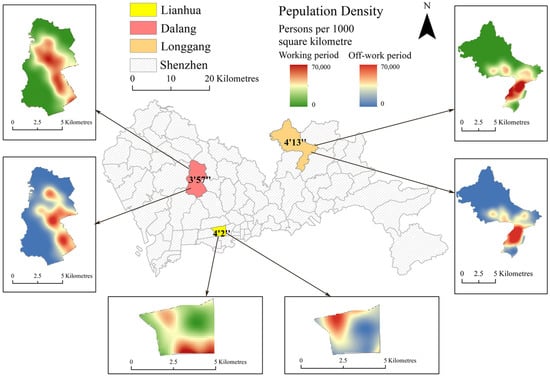 We selected three typical subdistricts in Shenzhen, to further investigate the effectiveness of our method in different population densities and distributions. We chose Lianhua subdistrict as an example of a densely populated region, Dalang subdistrict as an example of a moderately populated region, and Longgang subdistrict as an example of a sparsely populated region. The locations of these 3 subdistricts are shown in Figure 10.