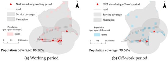 Through the implementation of our methodology across all subdistricts in Shenzhen, we have generated a comprehensive distribution of NAT sites at the city level. Our calculations reveal that a total of 2919 NAT sites were deployed in Shenzhen during the working period, with service coverage reaching 99.53% of the city’s residents. During the off-work period, 2899 NAT sites were deployed, with a maximum service distance of 900 m, effectively covering 99.48% of the population.