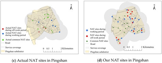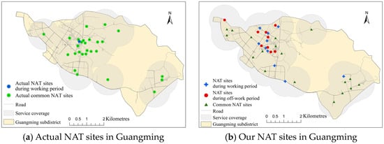 To study the rationality and applicability of this study, we collected the actual deployment of NAT sites in Shenzhen in November 2022. The Guangming and Pingshan subdistricts were selected to compare the actual scheme to the scheme evaluated by our method. Notably, the full scheme for the rest of the subdistricts in Shenzhen can be found in Appendix A.
