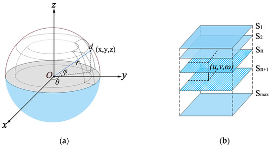 The sampling step in ray casting should be at most 1/2 of the data layer interval in volume data to achieve a good data reconstruction result according to the Nyquist sampling law [25]. The spacing of ocean scalar field data along the depth direction is arbitrary, showing a gradually sparse distribution along the negative direction of the z-axis. In the sampling process, we create a depth identification texture according to the distribution of the depth layer of the dataset and store the data layer at the current depth and the depth interval [Sn, In] between the next layer, avoiding data redundancy caused by excessive sampling between data layers with large depth spans. The specific storage method is shown in Figure 5a. First, we obtain the coordinate of the starting point of the ray and substitute it into the depth marker texture to obtain the number of data layers and the depth interval. Then, the sampling step is calculated adaptively according to the depth interval between adjacent data layers and the sampling density factor. The sampling step increases as the depth interval enlarges, and the sampling step is calculated in the following formula.