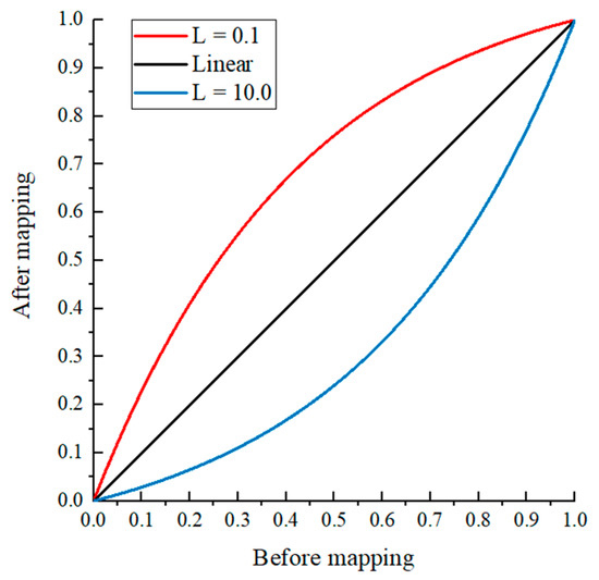 Nonlinear mapping function curve. The black line represents the linear mapping image, and the red and blue lines represent the nonlinear mapping function image when the nonlinearity factor is set to 0.1 and 10.0.