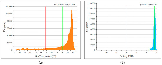 Seawater temperature is a physical quantity that characterizes the thermal condition of seawater. Solar radiation and ocean–atmosphere heat exchange are the two main factors affecting seawater temperature [28]. In addition, the current also significantly affects the seawater temperature in local sea areas. The surface seawater temperature decreases with depth, and the change within 1000 m is more prominent. In the range of 100–200 m of seawater, there is a layer with a sharp decrease in sea temperature between the thin warm water layer on the sea surface and the thick cold water layer below, which is called the thermocline, one of the critical phenomena in oceanographic research. The distribution of salinity in the open sea is relatively uniform, mainly impacted by ocean currents. Another factor affecting salinity is freshwater inflow, which mainly occurs in the estuaries of rivers. We chose the study area of the South China Sea and its surrounding waters, where the distribution of the ocean scalar field is affected by the Kuroshio tributaries. The temperature and salinity activities are more active in the ocean surface layer. Considering the above factors, our study concentrates on the sea temperature and salinity field in the range of 0–300 m in the South China Sea and its surrounding waters. We obtained the data distribution frequency statistical graph and the dataset’s skewness through statistical data analysis. In Figure 10, the red and green vertical lines represent the position of the median and average of the dataset in the histogram, respectively. We used the 1st to 3rd-order origin moments to calculate the skewness of the sea temperature dataset and the salinity dataset in the study area, which are −1.64 and −3.0. The distribution of seawater temperature and salinity in the study area has prominent negative skewness characteristics.