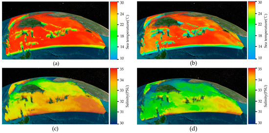 The surface salinity generally increases with sea depth in the South China Sea and its surrounding waters. In addition, ocean currents, vortex, and coastal freshwater injection also have an important impact on the salinity changes in the study area. The northwest coastal area of the Gulf of Thailand in the study area is fed by many rivers, and there is a seasonal circulation in the Gulf, resulting in significant variation in salinity in the Gulf of Thailand [30]. We designed two experiments to extract the current structure in the study area and the salinity change structure in the Gulf of Thailand according to the distribution characteristics of the salinity field in the study area. First, we set the normalized scalar value in [0.4,0.7] to the low transparency and the rest to the high transparency to obtain the ocean current structure extraction image of the study area, as shown in Figure 13a,b. The characteristics of sea surface salinity variation caused by ocean current disturbance is significant. In addition, we used a color band with a broader range and concentrated the function mapping interval in the salinity range in the Gulf of Thailand. The salinity variation structure extraction of the Gulf of Thailand and surrounding areas was obtained by setting the transparency of the normalized salinity in the interval [0.95,1] to 1.0. The spatial distribution characteristics of salinity caused by freshwater inflow and circulation in the Gulf of Thailand can be observed in Figure 13d.