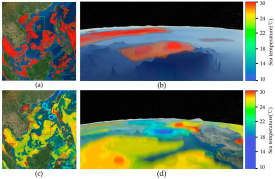Seawater temperature gradually decreases from low latitudes to high latitudes in most cases. In local sea areas, the changes in sea temperature and salinity are affected by seawater movement. Ocean currents and vortexes can cause an anomalous regional distribution of sea temperature and salinity. The South China Sea and its surrounding waters are affected by the Kuroshio Branch Current [29]. The mesoscale vortex shedding from the Kuroshio Branch Current will cause local thermal anomalies in this area. In this study, we designed two experiments to achieve the extraction of regional sea surface temperature anomalies in the research area. We can observe the temperature changes caused by ocean currents and vortices in the images enhanced by the nonlinear color-mapping scheme, providing a reference for the transparency transfer function’s design. In the first experiment, we set low transparency to the sea temperature in the interval of [0.9,1.0] and made the data of other intervals transparent. Thus, we realized the extraction of local heat water masses in the study area, as shown in Figure 12. In another experiment, we assigned a lower transparency to sea temperature values in the intervals [0.2,0.3] and [0.6,0.9] and a higher transparency to the other intervals, achieving the extraction of the regions of intensely hot and cold variations in the study area, which is shown in Figure 12.