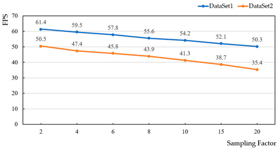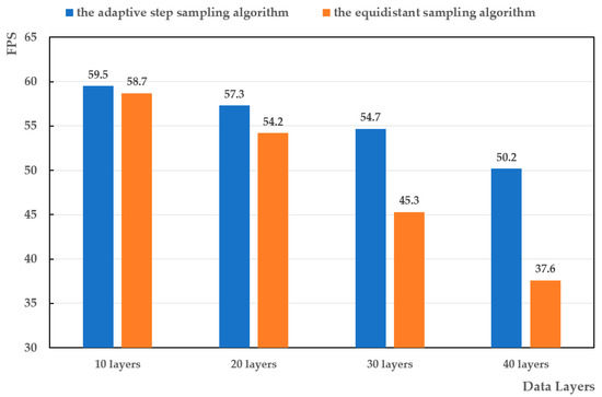 Moreover, in order to test the efficiency of the adaptive step-sampling algorithm proposed in this paper, we used the equidistant sampling algorithm as a comparison experiment. The frame rate test was performed on the first 10 layers, 20 layers, 30 layers, and 40 layers of DataSet2. The experimental results are shown in Figure 15.