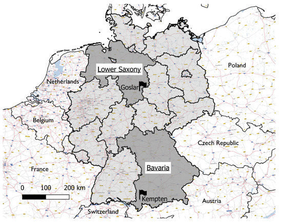 Kempten is a city with over 70,000 inhabitants in Bavaria close to the German border with Austria. Founded by the Romans, the city looks back on 2000 years of history. Kempten is centrally located in a hilly pre-Alpine landscape at an altitude of about 650 to 700 m above sea level (in the old town). The area of the city of Kempten is 63.28 km2. Although Kempten has more inhabitants than Goslar, the area size of Kempten is significantly smaller. The location of the two cities is shown in Figure 1.