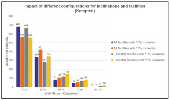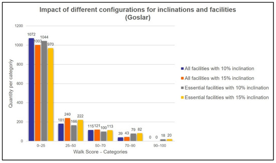 From the locations that are in the lowest WS range (this includes a WS score from 0 to 25), few or no facilities can be reached within 20 min. This category makes up the clear majority of the locations in the cities of Goslar and Kempten. The highest level (“walker’s paradise”) is only achieved in a few areas, and only in the old towns of Goslar and Kempten. However, in both cities, more areas fall into this desirable WS range if only essential supply facilities are considered. The difference in walkability caused by variations in the maximum gradient or modifications in respect of all vs. only essential amenities is greater in Kempten than in Goslar (Figure 2 and Figure 3).
