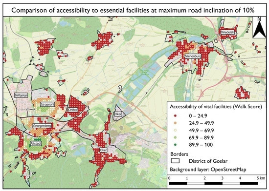 Following [48], we set a predefined 20 min walking time limit. A standard network routing algorithm returns the number of essential/all listed facilities that can be reached within the given limits for the walking time (20 min) and 10/15 percent maximum slope of the walking route. The maximum WS value (WS = 100) is achieved when all essential/all listed facilities (see Table 1) can be reached with a walking time of 5 min or less. The WS value decreases the longer it takes to reach facilities by foot and the fewer facilities can be reached within 20 min. WS = 0 indicates that no facility can be reached within 20 min walking time. The walking time depends on the walking speed, which in turn depends on the slope of the walking route.