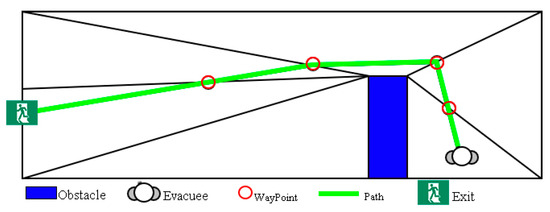 Figure 1 shows the projected path of an evacuee in a rectangular room. The evacuee is standing on the right side and plans to exit out on the left side. The navigation mesh is shown by the thin lines; an obstacle prevents the evacuee from walking straight to the exit. The path of the evacuee is shown as the green line and the waypoints are shown as red circles. A waypoint is generated for each edge that intersects the path.