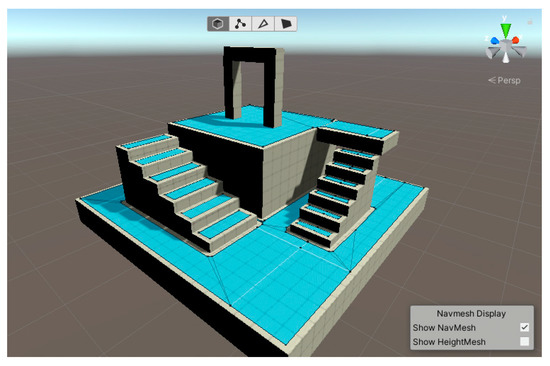In our study, Probuilder was used to implement the BIM part. Probuilder is a build-in tool for Unity to establish 3D models conveniently and includes stairs, planes, walls and corridors. Furthermore, models from Probuilder can be implemented with navigation mesh directly, as Figure 2 shows: