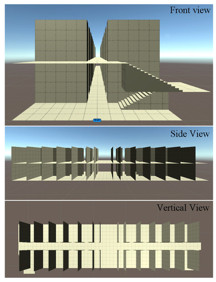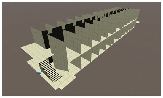 In this study, the Unity game engine was selected as the implementation platform to build the evacuation environment. A “game engine” refers to a set of components or systems that are pre-developed to allow developers to build the framework and core of a computer or video game easily. Using a game engine, developers can complete game production more quickly and efficiently through the functions and resources provided by the engine, rather than starting from scratch. At present, the two most commonly used game engines in the game industry are Unity and Unreal Engine 4. Among them, Unity is also widely used in the field of scientific research [40]. This study also uses Unity engine to construct the evacuation space. The Unity engine has powerful physical rendering effects, extremely low development costs and easy-to-use features, thus becoming the first choice for personnel simulation platforms [41]. The characteristics and advantages of the Unity engine are briefly introduced below.
