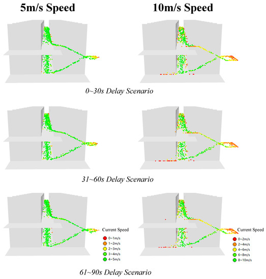 The congestion caused by different evacuation speeds is also different, even in the same evacuation environment. Helbing [43] studied evacuation speeds from 1.5 m/s to 10 m/s and showed that it caused congestion, which led to deaths and stampedes when speed reach over 5 m/s. Similarly, in this study, 5 m/s and 10 m/s were therefore selected to test if the degree of congestion will increase (Figure 10).