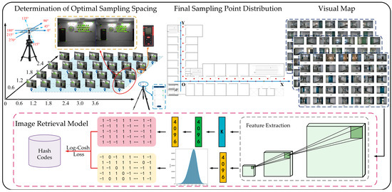 In visual indoor positioning systems, the method of constructing a visual map by point-by-point sampling is widely used due to its characteristics of clear static images and simple coordinate calculation. However, too small a sampling interval will cause image redundancy, while too large a sampling interval will lead to the absence of any scene images, which will result in worse positioning efficiency and inferior positioning accuracy. As a result, this paper proposed a visual map construction method based on pre-sampled image features matching, according to the epipolar geometry of adjacent position images, to determine the optimal sampling spacing within the constraints and effectively control the database size while ensuring the integrity of the image information. In addition, in order to realize the rapid retrieval of the visual map and reduce the positioning error caused by the time overhead, an image retrieval method based on deep hashing was also designed in this paper. This method used a convolutional neural network to extract image features to construct the semantic similarity structure to guide the generation of hash code. Based on the log-cosh function, this paper proposed a loss function whose function curve was smooth and not affected by outliers, and then integrated it into the deep network to optimize parameters, for fast and accurate image retrieval. Experiments on the FLICKR25K dataset and the visual map proved that the method proposed in this paper could achieve sub-second image retrieval with guaranteed accuracy, thereby demonstrating its promising performance.