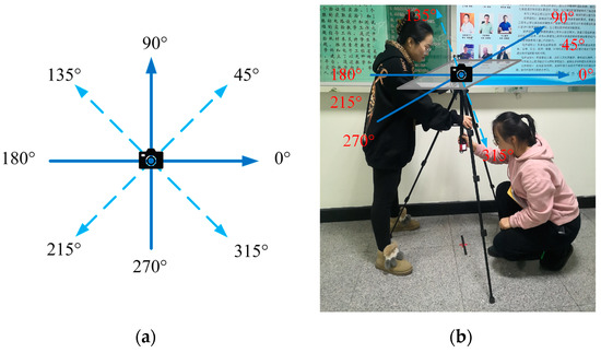Visual indoor localization is a special application of content-based image retrieval (CBIR). Image retrieval returns the database picture with comparable scene information to the query image, and the geographical coordinates of the query image may then be determined based on the annotated geographical coordinates of the database image. Therefore, the results of localization are extremely dependent on the image quality and the accuracy of the geographical coordinates of the offline database. The video-based approach to building a visual map has the advantage of simple sampling, but the visual sensor motion is not stable, which tends to lead to image blurring and to reduce the efficiency and the results of image matching. In addition, vision sensors struggle to maintain uniform motion, and non-uniform motion complicates the computation of geographical coordinates, resulting in incorrect location findings. Hence, in order to eliminate image blurring and ensure the reliability of geographical coordinates, this paper used a static image acquisition method. The equipment used to construct the visual map is shown in Figure 2. First, the image was captured using a DJI Pocket2 with three-axis mechanical stabilization, and the resolution of the image was 4608 × 3456. Then, the coordinates of the position of the equipment in the world coordinate system were calculated based on the laser rangefinder, and the angle of the capture was recorded using MATLAB Mobile. A mobile phone can be connected to MATLAB using this app, and the direction of the device can be collected by using the sensor module, including the azimuth, pitch, and roll. Additionally, sensor data can be streamed directly to the MathWorks Cloud for analysis, and data can be saved offline. For collecting complete picture information surrounding the shooting point, the camera captured pictures from eight different angles, as illustrated in Figure 3. Considering that the natural lighting in the indoor environment is not steady, artificial lighting was used to reduce blur and keep image noise to a minimum in order to decrease the influence of lighting variations on image retrieval.