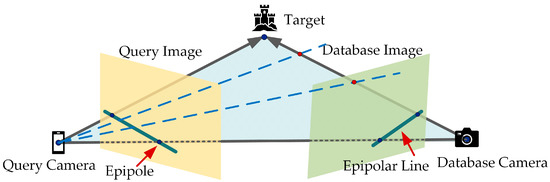 Using the point-by-point sampling approach, however, a small sample distance results in redundant picture information and a greater database size, which increases the retrieval complexity and time consumption. Excessive sampling spacing will lead to the lack of image information and coordinate information for some scenes in the visual map, limiting the accuracy of image retrieval or even making it impossible, resulting in the inability to achieve positioning in the online stage. As a result, and based on epipolar geometry, this paper proposes a visual map construction method that uses feature point matching, so as to determine the optimal sampling interval within the constraints and effectively control the scale of the database. As shown in Figure 4, the relative positional relationship between the query camera and the database camera can be estimated according to the epipolar geometry.
