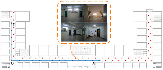 Statistical analysis was performed on the obtained experimental data, and as it was found that the coverage ratio was more likely to fall at or near 0.7, that value was selected. Due to the small error in solving the fundamental matrix when the feature point matching rate was above 50% in the online positioning stage, the matching rate was determined to be 0.5. Finally, based on the fact that the corridor width of the electronic laboratory building is 2 m and the physical structure of the building is tortuous and has a strong sense of depth, the optimal sampling spacing for the experimental environment was determined to be 3 m × 1.8 m. Figure 5 depicts the specific distribution of sample sites in the experimental situation, with the lower left corner representing the origin position and the red markers representing the sampling locations.