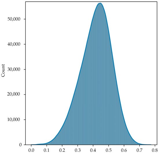 Image similarity is usually measured using Euclidean distance and cosine distance. Euclidean distance can reflect the absolute difference of individual numerical characteristics, while cosine distance is more about distinguishing differences in direction and is not sensitive to absolute values. Refer to [20] and calculate the cosine distances of the visual map images to generate the distribution displayed in Figure 7. Divide it into two parts according to the maximum value of the histogram, and use two semi-Gaussian distributions to fit them, respectively. The constructed semantic similarity matrix is as follows: