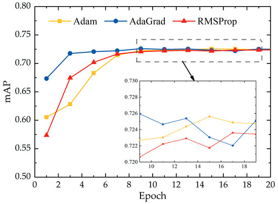 Nowadays, the optimization algorithms for adaptive learning rates include AdaGrad [21], RMSProp [22], and Adam [23]. The AdaGrad algorithm adjusts the learning rate according to the size of the gradient. When the gradient is large, the learning rate will decline significantly. Correspondingly, when the gradient is relatively small, the learning rate will drop less. Although this strategy produces superior results for convex optimization problems, it is not relevant to all deep-learning models. The RMSProp algorithm is a further improvement of the AdaGrad algorithm with an additional decay factor. Compared to the cumulative gradient approach of the AdaGrad algorithm, RMSProp accelerates the convergence by discarding some of the previous values, and the algorithm performs better under non-convex conditions. The Adam algorithm is essentially RMSProp with added momentum, which combines the advantages of the AdaGrad algorithm that make it good at dealing with sparse gradients and the RMSProp algorithm, which is good at dealing with non-stationary targets. Considering that the optimizer may have some influence on the performance of the model, the experiment was conducted on the dataset, the associated mAPs were calculated, and the acquired results are shown in the Figure 8. The experimental findings demonstrate that the mAPs achieved by the Adam optimizer and the AdaGrad optimizer are greater; nevertheless, the AdaGrad curve is unstable with a large amplitude. The reason for this is that the convergence speed of the AdaGrad optimizer for the loss function in this paper is too fast, which causes the descending result to jump repeatedly near the extreme value of the loss function. However, it is difficult to reach the extreme point, thus missing the optimal global solution. Hence, in this paper, Adam was chosen as the method for learning rate optimization in the experiments.