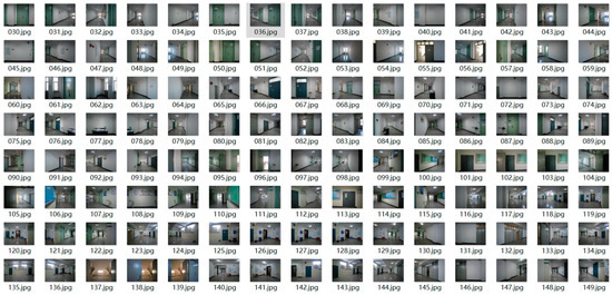 (2) In this paper, the captured images were preprocessed separately for rotation, brightness, and saturation, taking into consideration the different weather conditions, the variations in brightness and darkness of indoor ambient light, and the possible existence of a particular rotation angle when the user takes the image. The dataset for the relevant part of the visual map is shown in Figure 9. Due to the strong structural similarity and repetition of decorations in the indoor scenes in the dataset, a total of 97 categories and corresponding label IDs were set in this paper, and Table 2 illustrates some of the categories and corresponding label IDs in the visual map.
